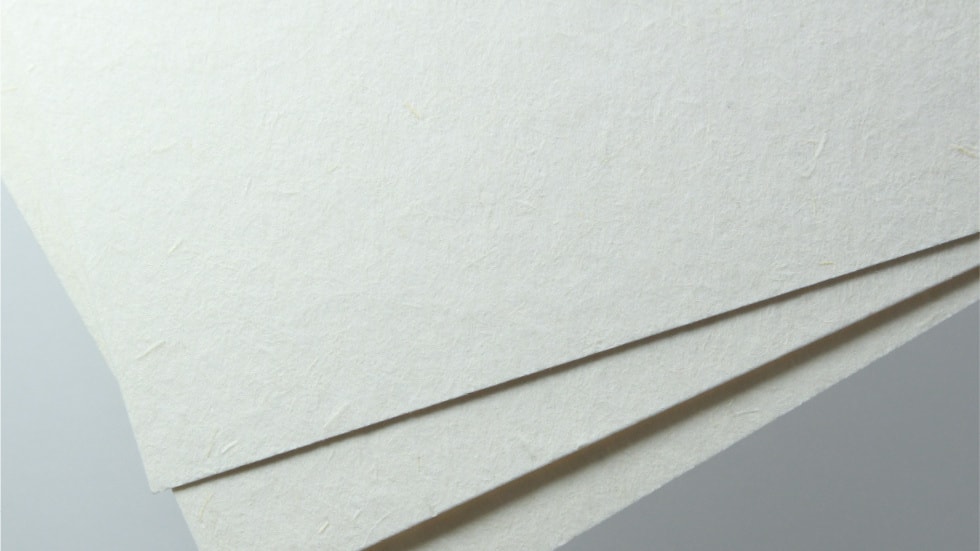 わらの繊維などの混ぜものを抄き込んだ和風の用紙です。古い民家の土壁を思わせるようなざらざらとした質感と、優しいクリーム系がベースの落ち着きのある色味が特徴です。使用している原料の素材感や質感が強いため、ベタ面の多いデザインですと色ムラが出てしまう可能性があります。