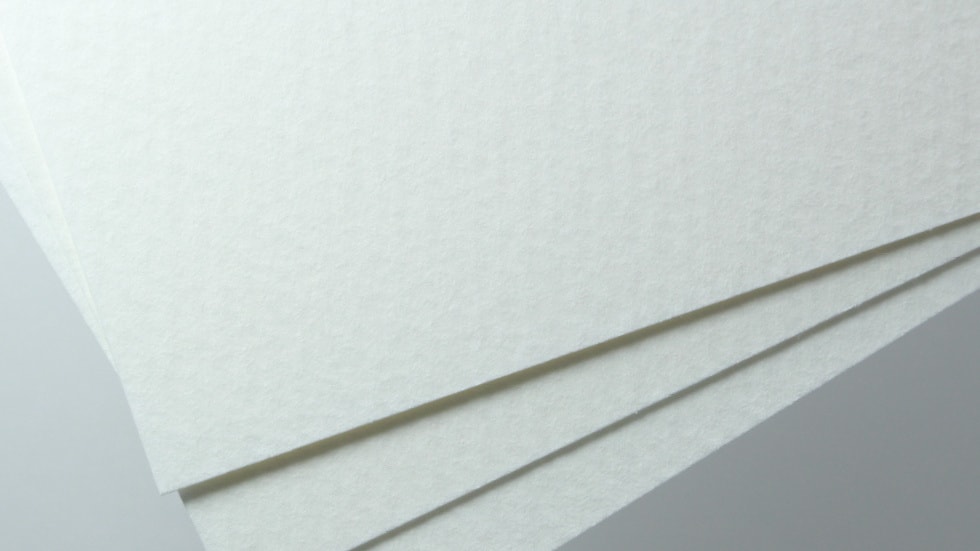 製造加工時に、織り模様のついた特殊なフェルト(毛布)を用いることで凹凸のある特徴的な風合いに仕上がります。凹凸がある用紙の為、印刷のムラが出やすい用紙ではありますが、文字自体は印刷が綺麗に仕上がりますので、ベタ面の少ないデザインにオススメです。