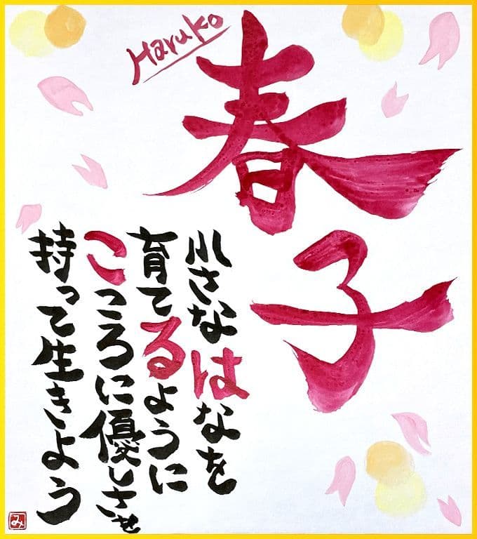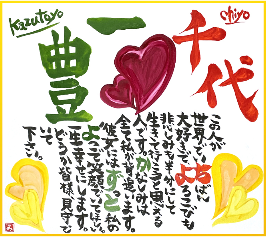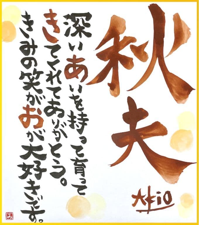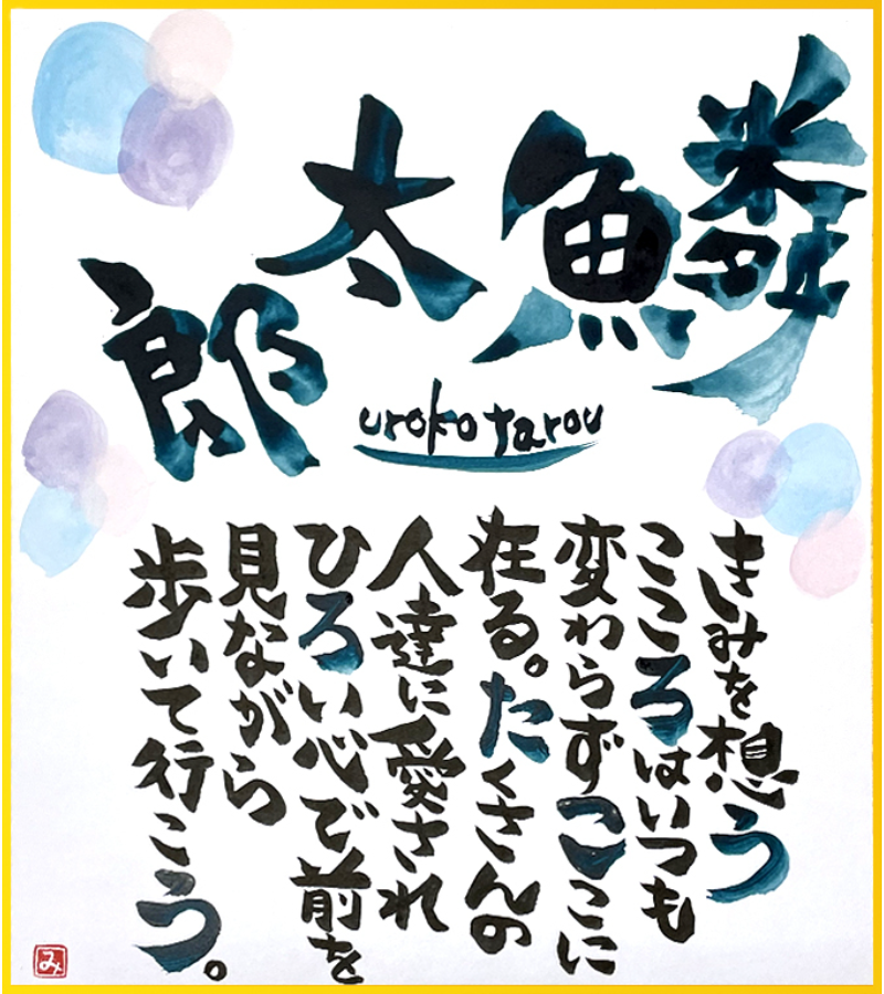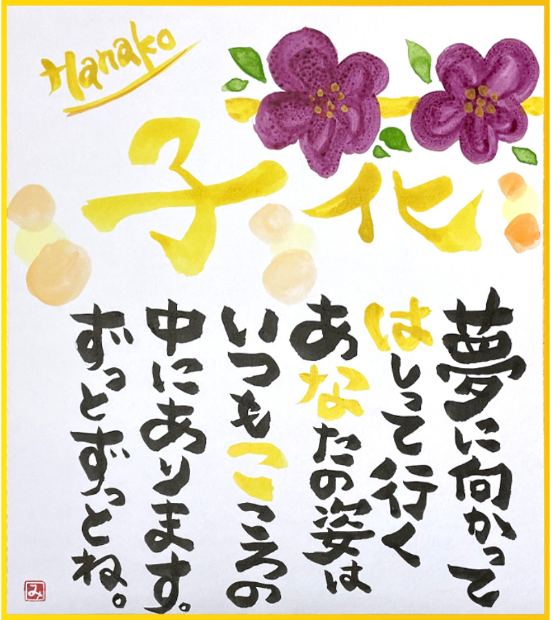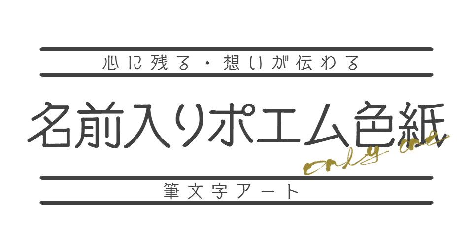 お誕生日、結婚祝い、卒入学祝い、母の日、父の日、長寿のお祝いに。世界でたったひとつ、あなただけの素敵な言葉のギフト。お名前から詩を考え、色紙に書かせていただきます。普段は伝えられない気持ち・願い・想いをひとつひとつ心を込めて書き上げます。